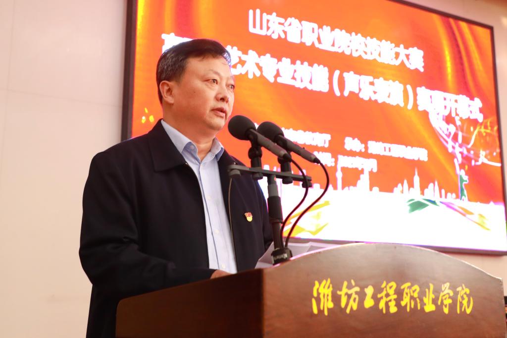 11月19日下午,2021年山东省职业院校技能大赛高职组艺术专业技能(声乐表演)赛项开幕式在潍坊工程职业学院举行,党委书记肖明胜、潍坊市教育局副局长韩光福、大赛执委会办公室主任党莹、大赛裁判长王桂升、专家委员会组长黄永健出席了开幕式,来自全省23所职业院校的领队、指导老师和参赛选手参加了开幕式。副院长王守庆主持。