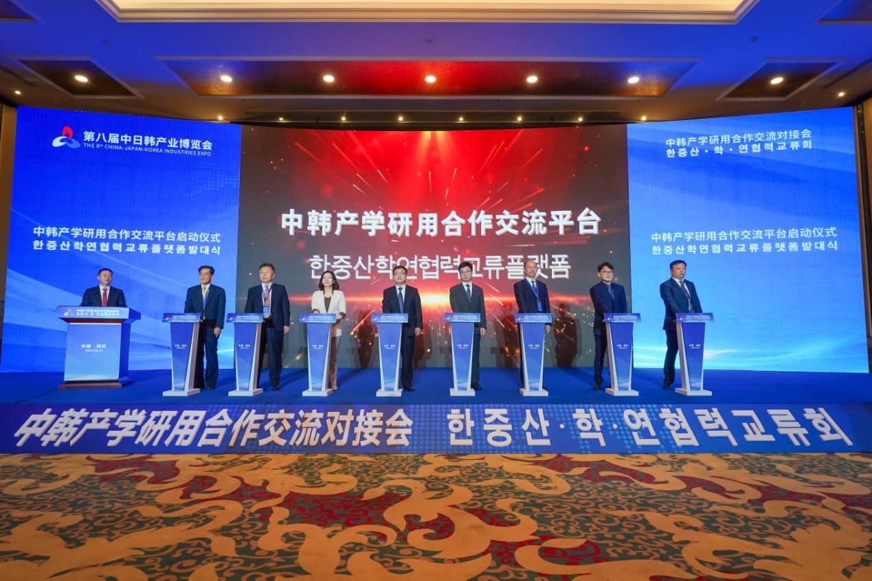6月24日,第八届中日韩产业博览会首场活动--中韩产学研用合作交流对接会在潍坊举办,党委书记肖明胜参加合作交流对接会,并与潍坊市领导和驻潍高校领导以及韩方代表一同现场启用中韩产学研用合作交流平台。