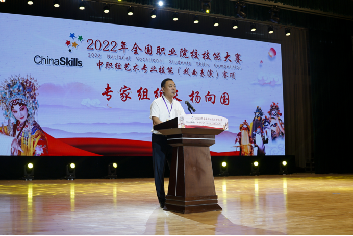 闭幕式上,赛项专家组组长杨向国对整个比赛进行了点评。杨向国表示,本次大赛精彩纷呈,公平公正,赛出了风格,赛出了水平。赛前各个院校精心组织选拔参赛选手,通过比赛涌现出了一大批有潜力、有发展的优秀青年选手。他希望各个院校今后在培养中职学生时,文武并重,全方面发展,在苦练基本功的同时,加强剧目教学课程,学习本剧种传统优秀剧目,丰富剧目储备,全方面提高学生的综合素质。最后,杨相国对协办方潍坊工程职业学院的充分准备、热情周到的服务表示充分的肯定和感谢。