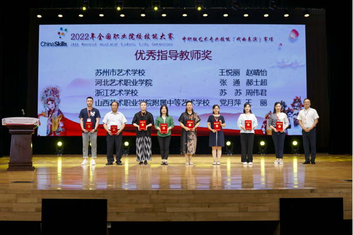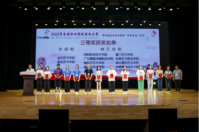 其中,苏州市艺术学校获得京昆组一等奖,河北艺术职业学院、浙江艺术学校、山西艺术职业学院附属中等艺术学校获得地方戏组一等奖;沈阳师范大学附属艺术学校获得京昆组二等奖,山东省文化艺术学校、湖北省艺术学校、湖南省艺术学校、江苏省戏剧学校、四川艺术职业学院、陕西艺术职业学院获得地方戏组二等奖;金华艺术学校、青岛艺术学校获得京昆组三等奖,洛阳职业技术学院、广东舞蹈戏剧职业学院、衡阳市艺术学校、福州市艺术学校、厦门艺术学校、安徽艺术职业学院、湖北黄冈艺术学校、安徽黄梅戏艺术职业学院获得地方戏组三等奖。获得一等奖代表队的指导教师荣获“优秀指导教师”奖。